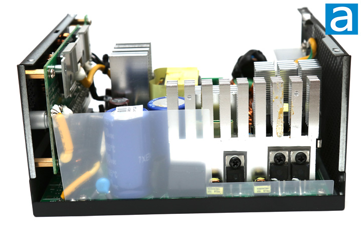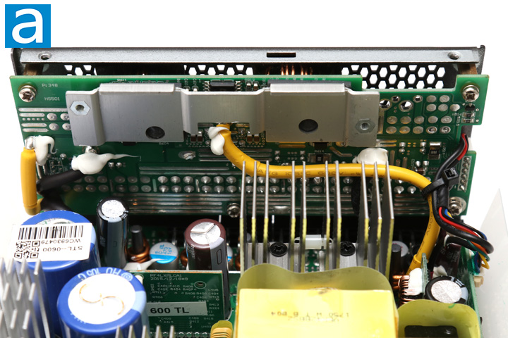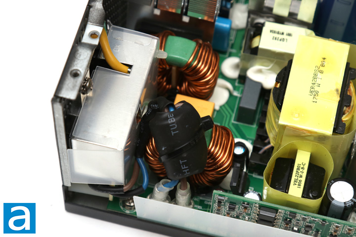 On the primary side, there are two Hitachi HU capacitors connected in parallel. One has a rating of 470uF at 400V while the other has a rating of 390uF at 400V. This makes for a total capacitance of 860uF. Both of these capacitors also have temperature ratings of 105c. I have not seen many Hitachi capacitors, though our recent GAMDIAS unit did use one. It is great to see Japanese capacitors here, though it is not a huge surprise for Seasonic, as they generally provide better reliability and boast a longer lifetime. A higher 105c temperature rating is also great to see, as some cheaper capacitors are only rated at 85c.