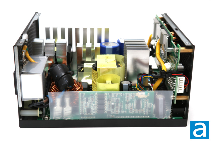 On the secondary side, we can see more Japanese brand capacitors from Chemi-con and Nichicon, all rated at 105c. As with modern high efficiency power supplies, all rectifiers produce the +12V out -- while the +5V and +3.3V outputs are generated from the +12V output using a DC to DC converter within the power supply unit. Most of these secondary components are actually hidden under a metal heatsink on the backside of the rear panel, with several thermal pads to aid in dispersing heat. This includes the ANPEC APW7159 synchronous buck PWM controller and six Infineon BSC0906NS MOSFETs responsible for generating the +5V and +3.3V outputs. The BSC0906NS's rated continuous drain current is 40A at 100c and a pulsed drain current of 252A. Drain source voltage is rated at 30V and a RDS(on) value of 0.0045 ohm maximum and 0.0038 ohm typical. Underneath the main board, four Infineon BSC014N04LS MOSFETs are responsible for generating the +12V output. The BSC014N04LS's rated continuous drain current is 40A at 100c and a pulsed drain current of 100A. Drain source voltage is rated at 40V, and a RDS(on) value of 0.0014 ohm maximum and 0.0011 ohm typical. These too are passively cooled with thermal pads in contact with the metal enclosure. Meanwhile, a Weltrend WT7527V IC is located on a side daughterboard, and it provides over/under current and over/under voltage protection. The datasheets for all components mentioned in this review can be found on their respective manufacturer's websites.