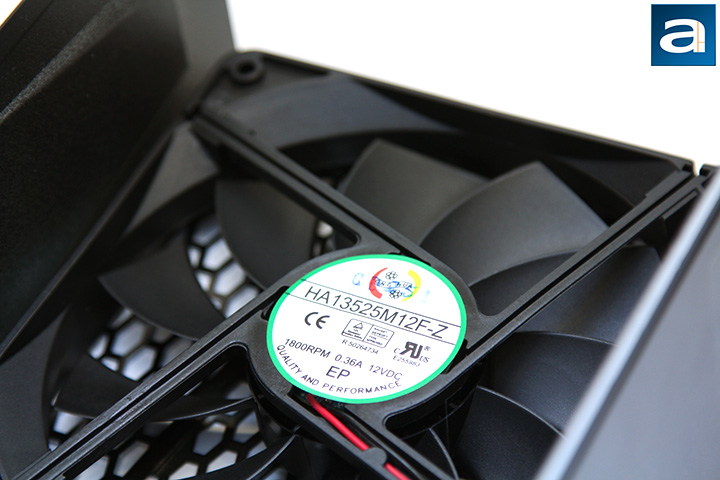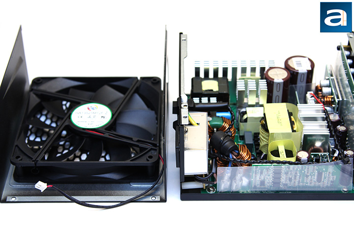Lastly, we see a 135mm fan that provides cooling to the Seasonic PRIME Titanium 850W's internal components. It is connected to the mainboard using a 2-pin connector. A 135mm fan is only marginally smaller than the 140mm maximum you can fit in an ATX power supply, and it is beneficial in most cases in providing lots of airflow at lower speeds for quiet operation. Hong Hua is the fan OEM, with HA13525M12F-Z as the model number, as shown in our photo above. Further research indicates the HA13525M12F-Z is a fluid dynamic bearing fan specified at 0.36A for a maximum of speed of 1800 rpm. The fan is not supposed to activate until the PSU is loaded to approximately 350W with Hybrid Mode active. As such, it should remain off for the most part -- and even when it is on, Seasonic uses a silent speed profile, so noise is not going to be a problem at all. Fans with fluid dynamic bearings generally have much longer lifespans compared to sleeve bearing fans, and is quite suitable for this application.