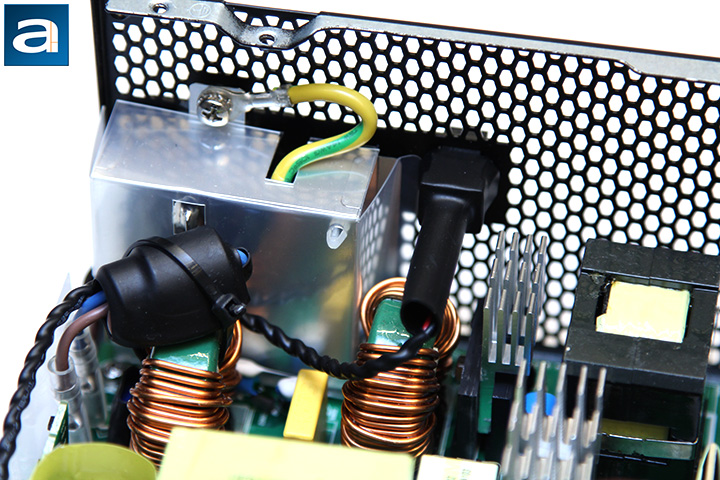 A quick tug on the shell, and we got straight to the internal inspection. The transient filter stage is the first input stage of a computer power supply, so we will take a look at that first. Seasonic has always done a great job in the past to make sure their power supplies met or exceeded the recommended requirements, and the Seasonic PRIME Titanium is no exception. The Seasonic PRIME Titanium 850W has two common mode chokes, one metal oxide varistor, three metalized polyester X-capacitors, and six ceramic Y-capacitors. This is three times the amount of X and Y capacitors than recommended. Considering how many modern-day PSUs have missing MOVs, I am happy to see it here, as this component is used to stabilize spikes from the AC line. A Sanken A6069H current mode control PWM regulator IC for controlling standby power can be spotted as well.