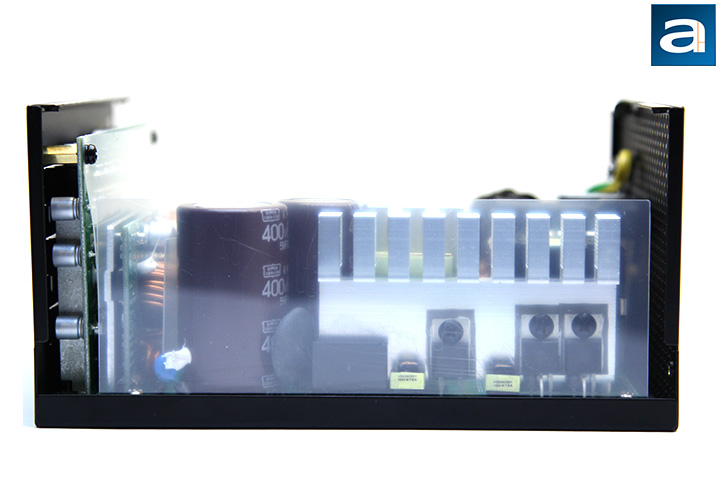 Disassembling the Seasonic PRIME Titanium 850W is quite straightforward with the removal of four screws. Built by Seasonic themselves -- probably not surprising to anyone in the room -- our photo above shows an overhead view of the its internal components. At first glance, the build quality appears to be excellent, as one would expect from the company. One unique feature of the PRIME Titanium series is that there are no power cables inside. The rear panel daughterboard is connected to the main PCB by a copper plate to reduce electrical losses and improve output quality. There are four heatsinks inside the power supply with all of them finned at the top. They are of various sizes, as you can see in our photo above.