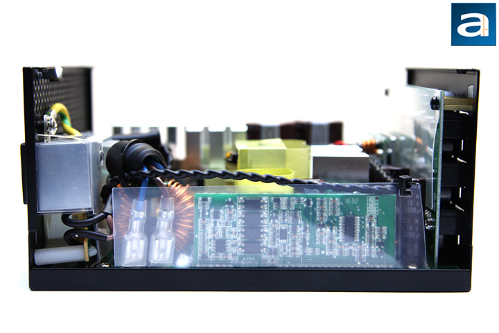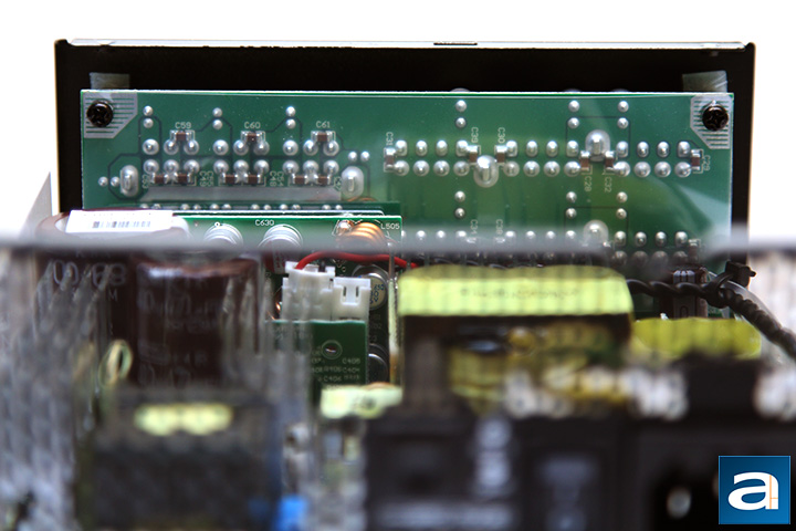 At the back, we have a large daughterboard covering the entire rear panel for the modular cable sockets. All modular sockets at the bottom are soldered directly to the main PCB after the secondary stage to reduce power transmission loss. The output connector configuration can be seen on the previous page. Overall, the internal build quality of Seasonic's PRIME Titanium 850W power supply is practically second to none -- nothing short of what we would expect from a flagship product from the company. Components are arranged beautifully for optimal cooling with almost no wires running around inside, and solder points on its green PCB are very clean in general. I would say the Seasonic branded, Seasonic built PRIME Titanium 850W is simply excellent with regards to the selection of components used under the hood.
