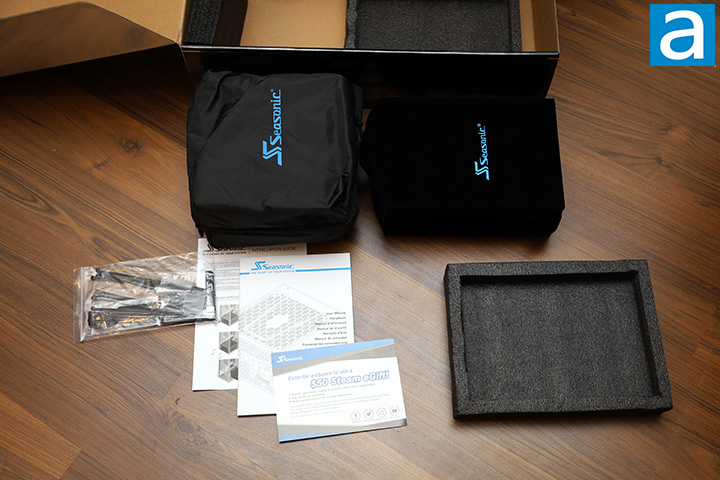 The Seasonic PRIME TX-1300 1300W's retail packaging can be opened by a flap attached on the right. Upon opening the box, you will find everything neatly organized. The power supply is located inside a drawstring suede bag on the right, cables in a nylon bag on the left, and everything else inside a resealable plastic bag. Out of the box, you will receive the PRIME TX-1300 1300W power supply itself, modular cables, AC power cable, power supply jump starter, Velcro straps, zip ties, four screws, case badges, manual, and a quick installation guide. Everything is presented well and appropriate for a flagship PSU.