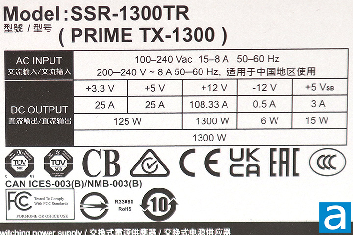 The voltage specification label is located on the top panel of the PRIME TX-1300 1300W. There are two main virtual rails. Up to 25A can be delivered via the +3.3V rail for a total of 82.5W, while the 25A on the +5V rail brings the output to 125W in this area. The total combined output for the +3.3V and +5V rail is 125W. In other words, your power allocation combination must fall within the limits of the listed specifications. Meanwhile, a single powerful +12V rail delivers up to 108.33A -- 1300W -- to maximize power delivery flexibility compared to multiple rails. Overall, the combined power output for the whole Seasonic PRIME TX-1300 1300W is 1300W, as its name suggests. It does sound a bit confusing to understand how this works at first, but generally speaking, this configuration allows sufficiently flexible power demands and should be sufficient to accommodate most users. The power outputs in the +3.3V and 5V rails is appropriate for its wattage class. You typically do not need more than 22A, because modern systems do not have a lot of need in this area.