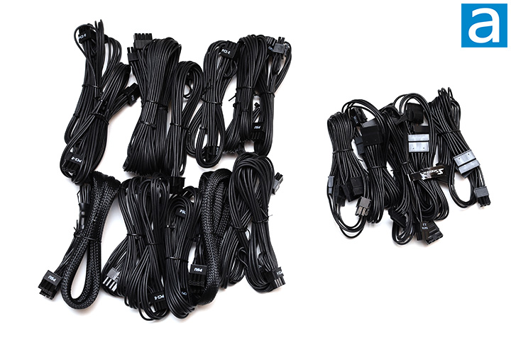 A total of twenty modular cables are included out of the box. All modular cables are either sleeved or braid patterned and are easy to bend, making them extremely easy to work with. The wires are not labeled, but from a visual inspection, it looks like the high current PCI Express and ATX/EPS connectors are 16 AWG with the rest 18 AWG. Manufacturers often will fatten high current cables to 16 AWG, so this is common practice.