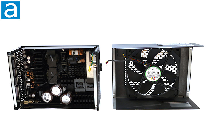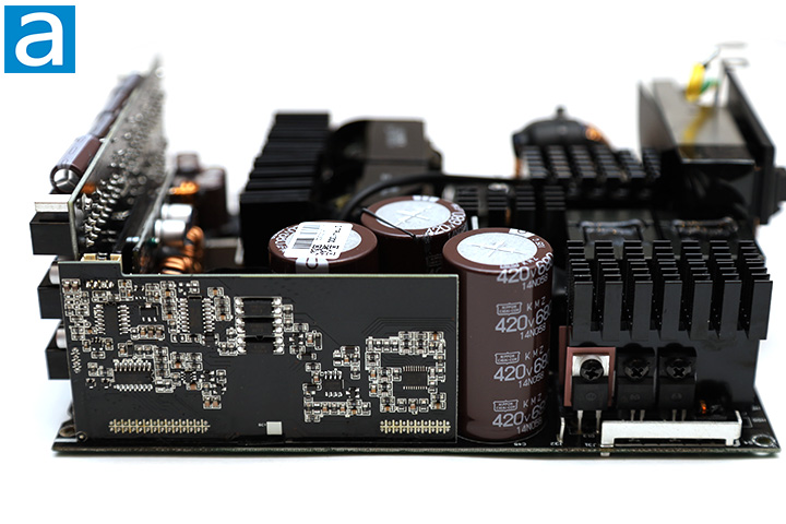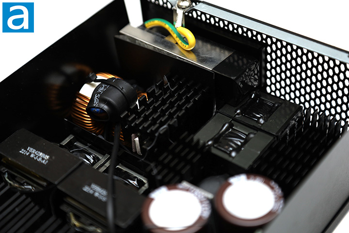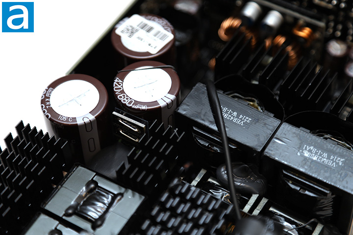 Our photo above shows an overhead view of its internal components. Its OEM is Seasonic themselves, which should be to nobody’s surprise. It features an LLC full bridge topology with bridgeless interleave PFC on the primary side and DC-to-DC converters on the secondary side. At first glance, the build quality appears to be excellent. There are four main heatsinks inside and almost no wires. They are finned and of various sizes, as you can see in our photo above.