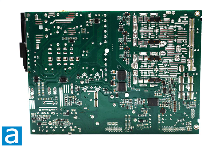 On the smaller heatsink adjacent to the bulk capacitors, we can see four more Infineon IPA60R125P6 power MOSFETs as the main switchers. Texas Instruments' UCD28070 is the PFC controller, located on the vertical board perpendicular to the rear connector board. The Champion CM6901T2X resonant controller and a pair of Silicon Labs Si8233BD driver ICs are part of the APFC controller circuit, located at the back of the main board.