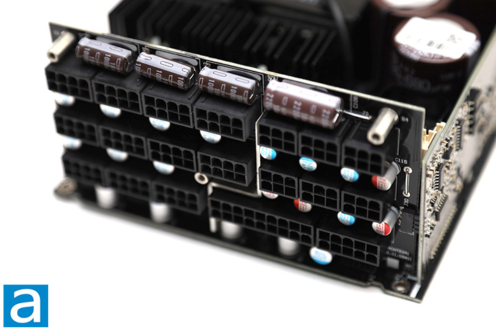 At the back, we have a large daughterboard covering the majority of the rear panel for the modular cable sockets. All modular sockets at the bottom are soldered directly to the main PCB after the secondary stage. Pin headers join the mainboard and daughterboard to reduce power transmission loss. The output connector configuration can be seen on the previous page. Overall, the internal build quality of Seasonic's PRIME TX-1300 1300W power supply is practically second to none -- nothing short of what we would expect from a flagship product from the company. Components are arranged beautifully for optimal cooling with almost no wires running around inside, and solder points on its black/green PCB is quite clean in general. I would say the Seasonic-branded, Seasonic-built PRIME TX-1300 1300W is simply excellent with regards to the selection of components used under the hood.