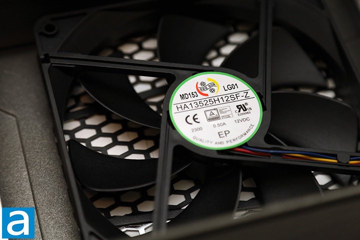 Lastly, we see a 135mm fan that provides cooling to the Seasonic PRIME TX-1300 1300W's internal components. It is connected to an add-in board using a 4-pin connector. A 135mm fan is only marginally smaller than the 140mm maximum you can fit in an ATX power supply, and it is beneficial in most cases in providing lots of airflow at lower speeds for quiet operation. The model of the fan is Hong Hua HA13525H12SF-Z, as shown in our photo above. The HA13525H12SF-Z is a fluid dynamic bearing fan specified at 0.50A for a maximum speed of 2300 RPM. The fan is not supposed to activate until the PSU is loaded to approximately 520W with Hybrid Mode active. As such, it should remain off for the most part, and even when it is on, Seasonic uses a silent speed profile, so noise is not going to be a problem at all. Fans with fluid dynamic bearings generally have much longer lifespans compared to sleeve bearing fans and is quite suitable for this application.