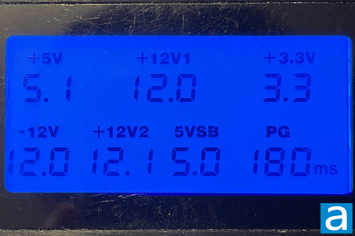 Voltages with minimal load are accurate, which is a basic requirement of power supplies out of the box. The Power Good or PG delay is tested at 180ms. This power supply is ATX 2.52 compliant and officially supports Alternative Sleep Mode with 100 to 150ms PG specifications, so it looks like the PSU tester I used was not fast enough to pick up the true PG signal. The ATX design specifications state a PSU's PG is required to be between 100ms and 500ms, with 250ms maximum for Non-Alternative Sleep Mode and 150ms for Alternative Sleep Mode.