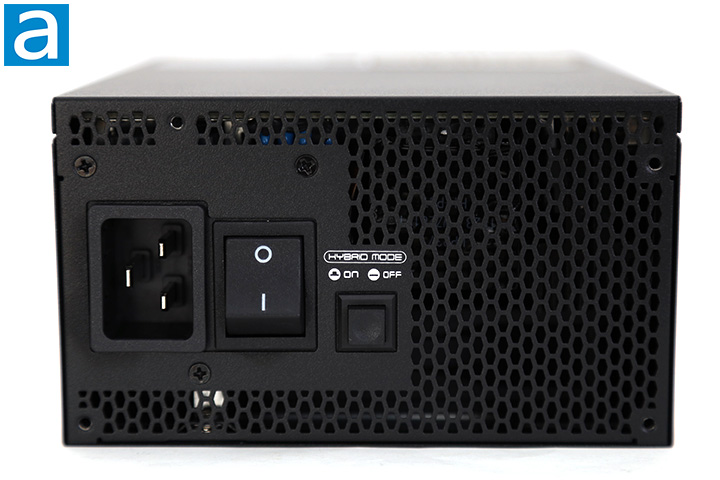 Starting from the back part of the power supply, we have the same familiar honeycomb mesh design as most PSUs with a bottom mounted fan. What you will find here is a vertically aligned C20 connector for power input on the western edge along with an on/off switch and a button to toggle Hybrid Mode. The C20 plug is used to ensure a high current certified power cable is used. The included AC power cable is a fat 14 AWG unit, but unless you have a stack of these kicking around, be sure not to lose it. I find having the Hybrid Mode switch here to be convenient, since some older power supplies have it on the inside rather than the outside. However, I do not see a reason why you will disable Hybrid Mode. Hybrid Mode keeps the fan off until it exceeds about 40% of the load threshold. Disabling Hybrid Mode ensures the fan stays on at all times, but the Seasonic PRIME TX-1300 ATX 3.0 1300W is intelligently designed to keep it from overheating regardless of what the active setting is.