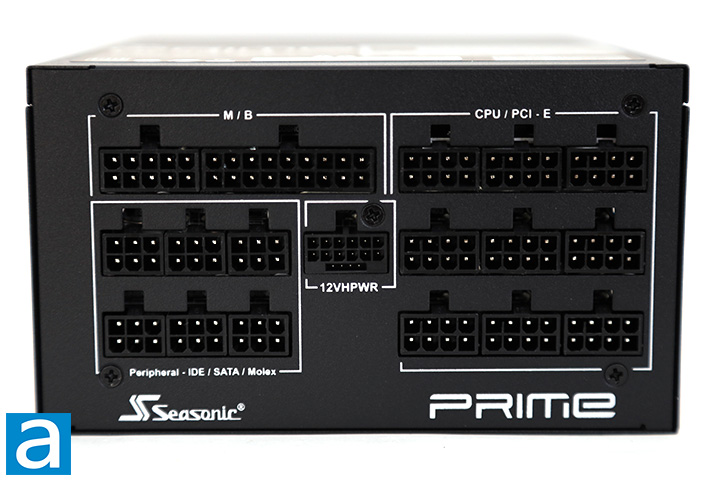 The rear cable connection panel is done nicely. Seasonic has made the labels correct side up in standard orientation. Similar connectors are grouped together and are laid out in a very logical manner. To ensure you know what is going on, they are all grouped and clearly labeled for minimal ambiguity. Starting from the left, we have the Motherboard section that supports an ATX 24-pin connector by two separate blocks next to each other. In the Peripherals section, six outputs support Molex and SATA peripherals. A 16-pin 600W 12VHPWR PCIe 5.0 header is next. Lastly, a group of nine connectors are present for PCI Express 6+2 pin or ATX/EPS 4+4 pin cables. Incompatible outputs will not physically fit into each other, so Seasonic has done a great job in this regard. This generous array of available connectors should be more than sufficient for casual users and power enthusiasts alike.