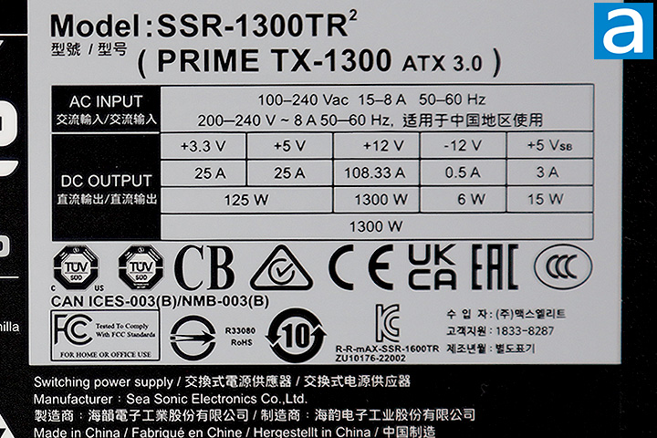 The voltage specification label is located on the top panel of the PRIME TX-1300 ATX 3.0 1300W. There are two main virtual rails. Up to 25A can be delivered via the +3.3V rail for a total of 82.5W, while the 25A on the +5V rail brings the output to 125W in this area. The total combined output for the +3.3V and +5V rail is 125W. In other words, your power allocation combination must fall within the limits of the listed specifications. Meanwhile, a single powerful +12V rail delivers up to 108.33A -- 1300W -- to maximize power delivery flexibility compared to multiple rails. Overall, the combined power output for the whole Seasonic PRIME TX-1300 ATX 3.0 1300W is 1300W, as its name suggests. It does sound a bit confusing to understand how this works at first, but generally speaking, this configuration allows sufficiently flexible power demands and should be sufficient to accommodate most users. The power outputs in the +3.3V and 5V rails are appropriate for its wattage class. You typically do not need more than 22A, because modern systems do not have a lot of need in this area.