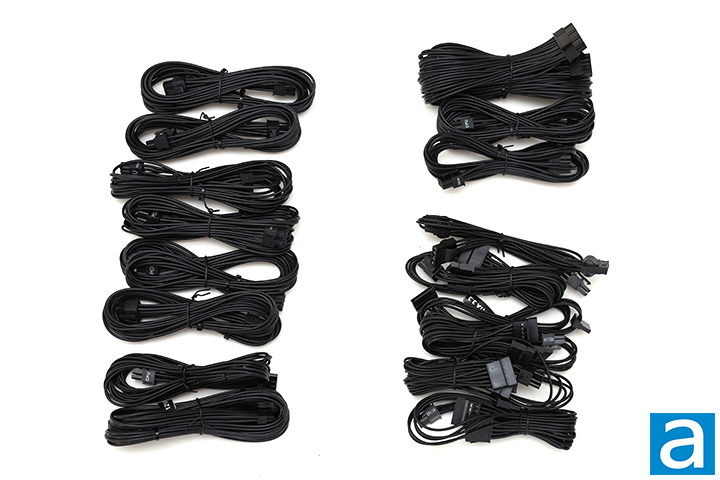 A total of seventeen modular cables are included out of the box. All modular cables are either sleeved or braid patterned and are easy to bend, making them extremely easy to work with. The wires are not labeled, but from a visual inspection, it looks like the high current PCI Express and ATX/EPS connectors are 16 AWG with the rest 18 AWG. Manufacturers often will fatten high current cables to 16 AWG, so this is common practice.