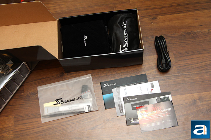The Seasonic PRIME Ultra Titanium 850W's retail packaging can be opened by a flap attached on the right. Upon opening the box, you will find everything neatly organized. The power supply is located inside a drawstring suede bag on the right, cables in a nylon bag on the left, and everything else inside a resealable translucent plastic bag. Out of the box, you will receive the PRIME Ultra Titanium 850W power supply itself, modular cables, AC power cable, power supply jump starter, Velcro straps, zip ties, four screws, case badge, sticker, and a manual. The power supply jump starter is something the non-Ultra model did not come with. Everything is presented well and appropriate for a flagship PSU.