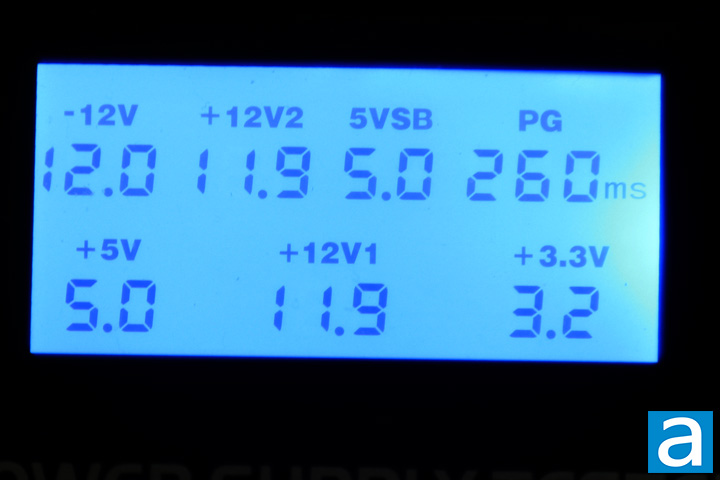 Voltages with minimal load are generally accurate, which is a basic requirement of power supplies out of the box. In this situation all are within 4%. The PG (Power Good) delay seems to be well within its rated range and general power supply standard at 260ms.