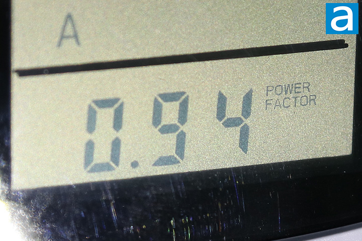 Active power correction is important to correct AC load line loss. In AC power, there are three components to it as there is a phase difference between current and voltage. This makes up the power triangle, which consists of the following: Average usable power (P, measured in watts), reactive power (Q, denoted as VA-R), and total power (S, written as VA). While these components all measure power, they are not the same as each other. What we want is the average usable power, with as little wasted reactive power as possible. The total power provided over the AC line is the magnitude of the two combined (sqrt(P^2+Q^2)). Power factor can then be easily calculated by P/S. The ideal value is 1.00, and this is where active PFC comes in. Under nominal loads, the power factor value of the Seasonic S12III 500W was 0.94, indicating that the active PFC function is working well.