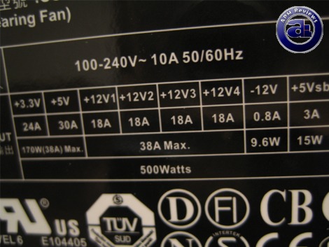 A quick glance beneath the +12V table shows that the 4x+12V rails can only provide up to 38A of power. Mathematically speaking, 18A*4 is 72A, not 38A. A look inside the power supply unit itself (We'll go over this shortly after) reveals that the Seasonic M12 500W does not really have 4x12V rails; but instead theoretically implemented by splitting it into four "virtual" rails. This provides as advantage as certain components such as high power requirement graphics card can significantly load down on a single +12V rail; and with a quad "virtual" rail would suit better for this purpose. As all things come at a cost, you will not receive the advantage of quad independent rails in regards to aspects such as electrical noise.