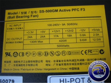 The voltage specification label on the side of the Seasonic M12II. I found this a bit interesting because it is rated lower than the Seasonic M12 -- the Seasonic M12 500W allows a maximum of 24A on the +3.3V rail, and 30A on the +5V rail for a combined total of 170W maximum output. The Seasonic M12II had the 5V rail reduced to 24A, for a combined output of 130W on the +3.3V and +5V rails. For the 12V rail, the original M12 has four virtual rails for a combined output of up to 38A (456W); however the Seasonic M12II dropped it to two virtual +12V rails that can be fully utilized at 17A+18A for up to 420W output. The combined for all voltage rails are 500W, making the Seasonic M12II 500W a... 500W power supply. Anyways, either way these are decent numbers for a 500W power supply, and from an engineering standpoint this reconfiguration of rails would probably make power delivery a bit more efficient than before. I can't imagine anyone pulling 456W on the +12V rail out of a 500W power supply anyway.