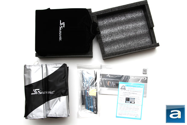 The packaging of Seasonic's Platinum 1000W power supply unit deserves a section by itself, not because it is very good, but because it is clean and very good. For power supplies of this caliber, it is almost reasonable to expect manufacturers to do away with the standard plastic bag packaging -- and Seasonic is no exception here. But unlike the outstanding but rather complicated execution seen with the Thermaltake Toughpower Grand 1200W, the Platinum finishes the task with minimal amounts of material under the flap top box. Sandwiched between two Styrofoam bracket is the PSU itself inside a soft drawstring bag, followed by a dual section Velcro enclosed modular cable bag with the power cord sandwiched between its legs, resealable clear plastic bag with miscellaneous accessories, manual, and warranty information card. Miscellaneous accessories include zip ties, Velcro straps, four screws, case badge, and even a screwdriver.