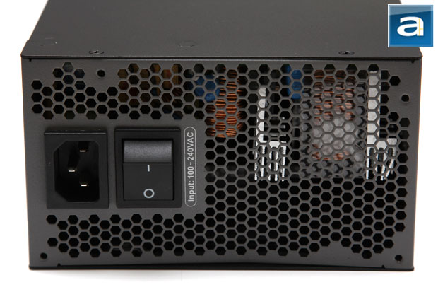 Starting from the back part of the power supply, we have the same familiar honeycomb mesh design like most PSUs with bottom mounted fans; and the standard on/off switch located below the male connector for power input on the western edge. The low resistance honeycomb mesh design is implemented to maximize airflow and minimize air resistance. This is done as heat needs to leave the power supply as easily and efficiently as possible, because the Seasonic Platinum 1000W incorporates only one 120mm fan at the bottom, with no auxiliary fans. The design is acceptably efficient with regards to the ratio of total surface area to open mesh coverage, except something makes me wonder why anyone would need a switch that large, haha. As with most new power supplies, the Seasonic Platinum 1000W has an automatic full range (100V-240V) AC line voltage selection, so the user does not have to worry about manually selecting input voltage.
