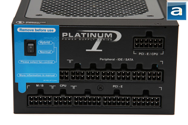 The rear cable connection panel is done nicely, albeit with upside-down labels in standard orientation. As you can see in our photo above, a fan control switch is found at the upper left corner, which is somewhat of a deviation from Cooler Master's implementation of having a full on 5.25" bay fan controller. Generally speaking, I don't see a reason why you won't leave it on '0'. '0' is Hybrid Mode, which keeps the fan off until it exceeds the 30% +/- 5% load threshold. '1' ensures the fan stays on at all times, but the Seasonic Platinum is intelligently designed to keep it from overheating regardless of what mode it is in.