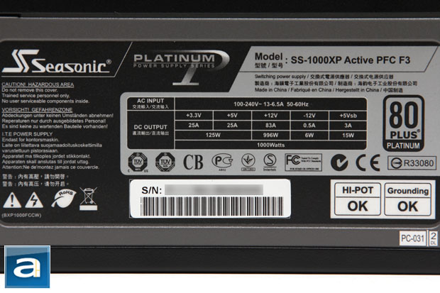 The voltage specification label at the top of the Seasonic Platinum 1000W. There are two main virtual rails. Up to 25A can be delivered via the +3.3V rail for a total of 82.5W; while 25A on the +5V rail brings the output to 125W in this area. The total combined output for the +3.3V and +5V rail is 125W. In other words, your power allocation combination must fall within the limits of the listed specifications. Meanwhile, a single powerful +12V rail delivers up to 83A (996W) to reduce operating overhead compared to multiple +12V rails. Overall, the combined power output for the whole Platinum is... well, 1000W haha. Again, your power distribution in your system must fall within the limits provided -- it must not exceed 82.5W on the +3.3V rail, 125W on the +5V rail and 125W combined for both, 995W on the +12V rail, and 1000W combined between the +12V and +3.3/+5V rails. It does sound a bit confusing to understand how this works at first, but generally speaking, this configuration allows very flexible power demands and should be sufficient to accommodate most users. On the other hand, I have seen lower wattage PSUs with more combined power on the +3.3V/+5V rail, so I would actually expect a little more in this area for a 1000W power supply unit.