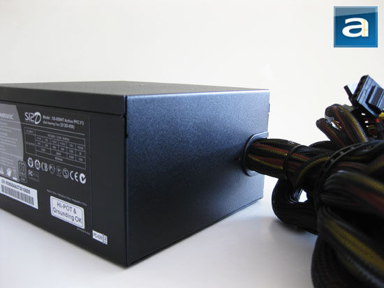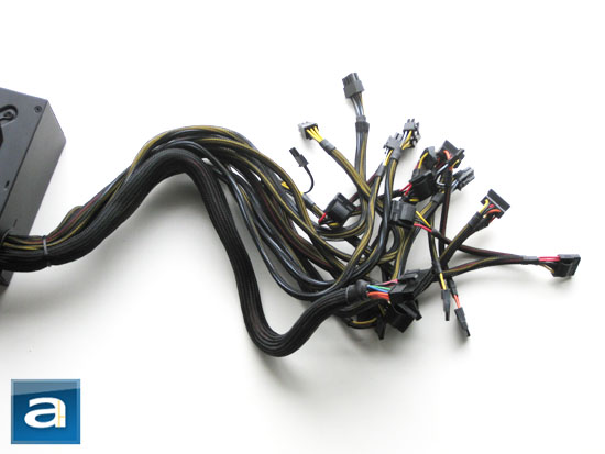 A C-shaped opening on the right side of the power supply (From the angle above) means that in a typical configuration, the cables leave the power supply at the end near the inside panel of your case. By doing this, it makes clean cabling a little easier for the user. The lead out is done cleanly from this angle, and all cables are properly sleeved and strapped together at this point.