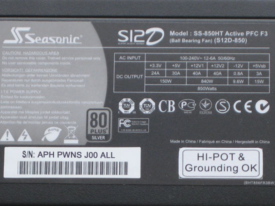 The voltage specification label on the side of the Seasonic S12D. There are two virtual rails. Up to 24A can be delivered via the +3.3V rail for a total of 79.2W; while 30A is available on the +5V rail for 150W output. The total combined output for the +3.3V and +5V rail is also 150W. This means that your power allocation combination must fall within the limits of the listed specifications. Meanwhile, each of the two +12V rails can provide up to 40A for a total of 840W combined -- very impressive. Overall, the combined power output is... well, 850W haha. Again, your power distribution in your system must fall within the limits provided -- it must not exceed 79.2W on the +3.3V rail, 150W on the +5V rail and 150W combined for both, 480W on the +12V rails up to 840W combined, and 850W combined between the +12V and +3.3/+5V rails. It does sound a bit confusing to understand how this works at first, but generally speaking this configuration allows very flexible power demands and should be sufficient to accommodate most users.