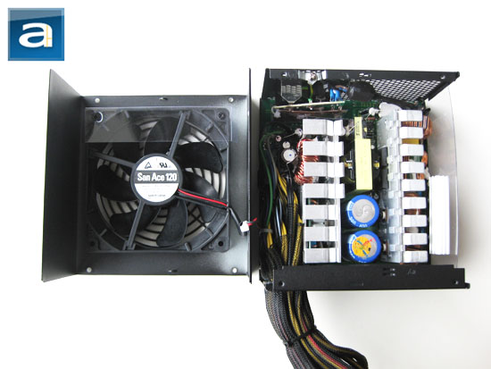 Initially, I was very tempted to replace the internal 120mm power supply fan with my Noctua NF-P12 upon the opening of the Seasonic S12D. However, I was pleasantly surprised when I discovered that the fan is actually a San Ace (Sanyo Denki) unit! While previous Seasonic products proved to be extremely quiet in every day operation from my experience, the company usually implements ADDA fans. The way Seasonic uses them is optimal, but it is not the nature of the fans to provide superior cooling to noise ratio. San Ace fans are highly regarded among certain enthusiast circles for its excellent performance and airflow; that's not to mention that San Ace products are actually particularly hard to find at North America retailers. That said, if you ever decide to modify your S12D's cooling, the fan is actually connected to the main unit via a 2-pin connection -- it's an easy swap shall the fan die one day, since it is not soldered in.