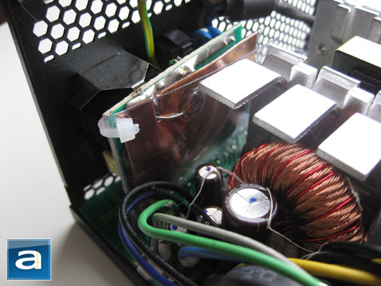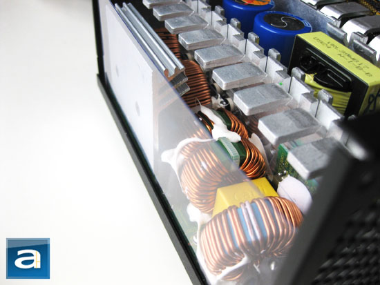 The transient filter stage is the first input stage of a computer power supply, so we'll take a look at that first. As shown in the photo above, components are placed behind a transparent plastic wall for additional protection, since the shell is made of metal, after all -- and some of these components are placed very close to the edge. Seasonic certainly did not cheap out in this area -- it has four ferrite coils, two metalized polyester X-capacitors, four ceramic Y-capacitors, and one metal oxide varistor. This is very impressive, as there's practically twice as many of each component as you would find in a standard quality power supply unit!