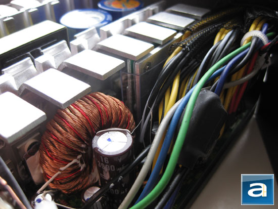 An overhead view of the Seasonic S12D 850W's internals show a very clean design, with components well placed for optimal cooling and reduced heat congestion. Two 'toothed' aluminum heatsinks are used for increased airflow, without reducing cooling capabilities. Seasonic has an excellent reputation for superior build quality, and it appears that the S12D is no exception, as seen in the photo above. But it's the details that count, right? Don't worry, I'm not going to waste any of your time -- let's take a closer look.