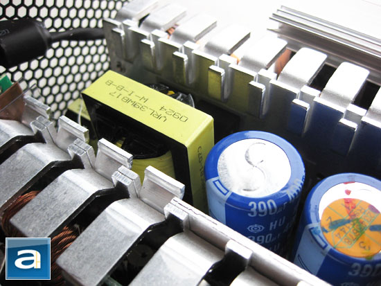 Two Chemi-Con Japanese brand capacitors are connected in parallel. Reviews of Seasonic's S12D 750W around the web indicates that our 850W's lower brethren uses one 330µF x 400V and one 390µF x 400V capacitor, but our 850W version incorporates two 390µF x 400V Chemi-Con capacitors for a total capacitance equivalence of a single 780µF x 400V capacitor. These units are rated at 105c; whereas typical power supplies usually use 85c rated capacitors.
