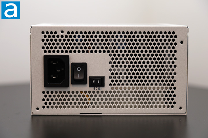 Starting from the back part of the power supply, we have the same familiar honeycomb mesh design as most PSUs with a bottom mounted fan. What you will find here is a vertically aligned male connector for power input on the western edge along with an on/off switch and another rocker switch to toggle semi-fanless mode next to it. I find having the semi-fanless toggle switch here to be convenient, since some older power supplies have it on the inside rather than the outside. However, I do not see a reason why you will disable semi-fanless operation. Semi-fanless mode keeps the fan off until it exceeds about 40% of the load threshold, or 340W. Disabling semi-fanless mode ensures the fan stays on at all times, but the SilverStone DA850R Gold 850W is intelligently designed to keep it from overheating regardless of what the active setting is.