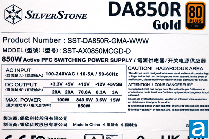 The voltage specification label is located on the top panel of the DA850R Gold 850W. There are two main virtual rails. Up to 20A can be delivered via the +3.3V rail for a total of 66W, while the 20A on the +5V rail brings the output to 100W in this area. The total combined output for the +3.3V and +5V rail is 100W. In other words, your power allocation combination must fall within the limits of the listed specifications. Meanwhile, a single powerful +12V rail delivers up to 70.8A -- 849.6W -- to maximize power delivery flexibility compared to multiple rails. Overall, the combined power output for the whole SilverStone DA850R Gold 850W is 850W, as its name suggests. It does sound a bit confusing to understand how this works at first, but generally speaking, this configuration allows sufficiently flexible power demands and should be sufficient to accommodate most users. The power outputs in the +3.3V and 5V rails are within the norm, as most PSUs in this wattage range released in the last few years usually have them between 20A and 22A. This is because modern systems do not have a lot of need in this area.