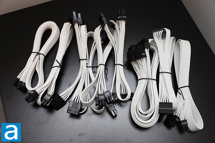 A total of nine modular cables are included out of the box. All modular cables are flat and easy to bend, making them extremely easy to work with. 16 AWG wires are found on the 12V-2x6 cable. Everything else is 18 AWG, which is common and expected with modern power supply units.