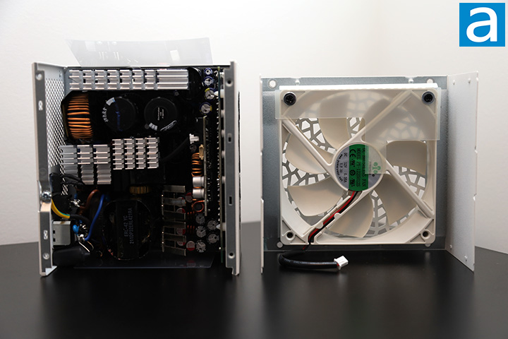 Lastly, we see a 120mm fan that provides cooling to the SilverStone DA850R Gold 850W's internal components. It is connected to an add-in board with a Weltrend WT51F104 microcontroller using a 2-pin connector. A 120mm fan is rather small nowadays for a power supply with a bottom mounted fan, but if not a lot of heat is being generated, noise will be kept to a minimum.