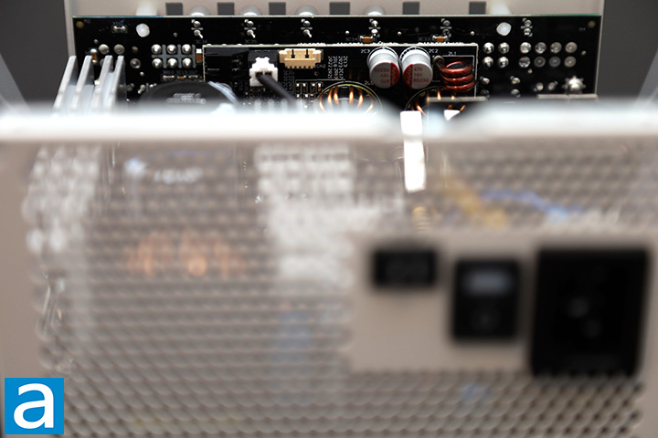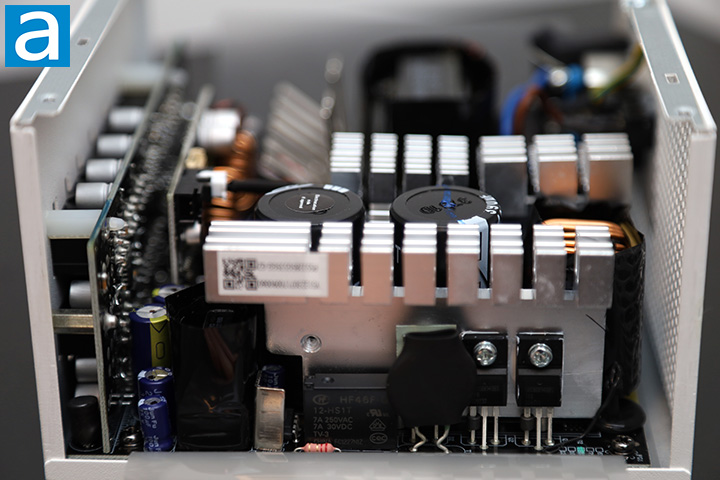 The active PFC circuit featured on the SilverStone DA850R Gold 850W uses two bridge rectifiers on both sides of the heatsink closest to the transient filter stage. Unfortunately, I was unable to see their brand and part number.