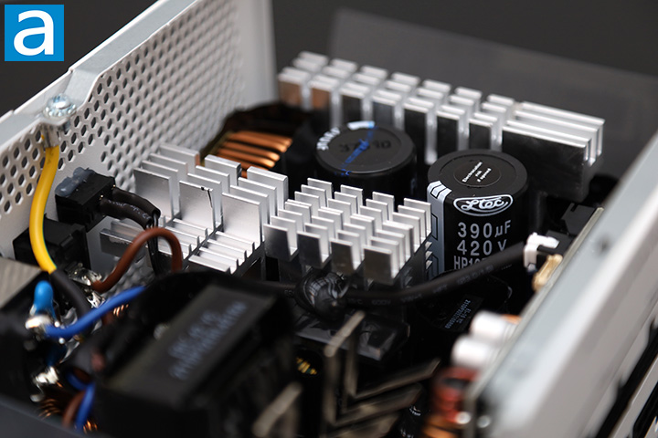 On the primary side, we can see two Taiwanese-made LTEC capacitors. Our 850W version of SilverStone's DA850R Gold power supply incorporates two 390µF x 420V capacitors in parallel for an equivalent capacitance of 780µF x 420V. It is rated at 105c, whereas more value-oriented power supplies usually use 85c rated capacitors.