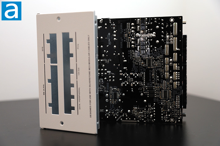At the back, we have a large daughterboard covering the majority of the rear panel for the modular cable sockets. All modular sockets at the bottom are soldered directly to the main PCB after the secondary stage. Pin headers join the mainboard and daughterboard to reduce power transmission loss. The output connector configuration can be seen on the previous page.
