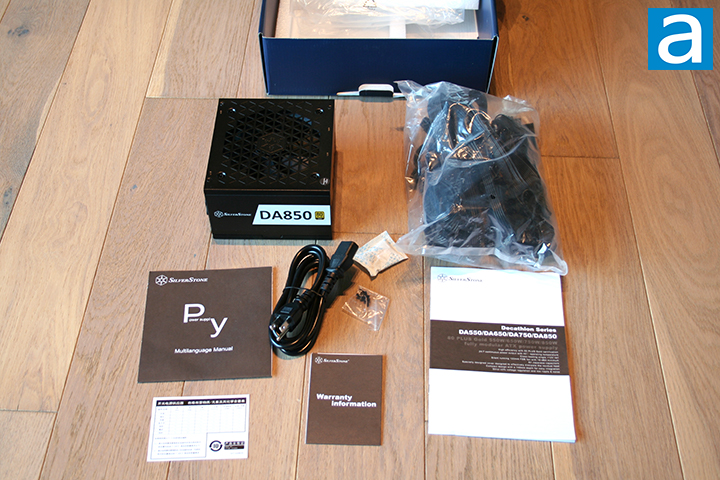 The SilverStone Decathlon DA850 Gold 850W's retail packaging can be opened by a flap along the bottom. The power supply unit came to us placed inside a Styrofoam bracket. The cables are bundled in a nylon bag. As with other SilverStone PSUs, we have two booklets to describe the different qualities and limits of the unit, as well as some usage instructions. Just to note, this PSU comes with a 3-year warranty. More information regarding the warranty can be found in the warranty information booklet included with the Decathlon DA850 Gold 850W package.