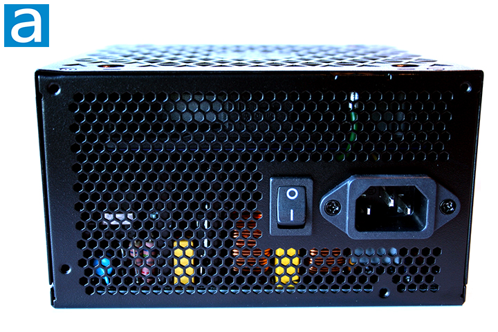 Taking a look at the exposed side of the power supply, we can see the power input and switch. Both the receptacle input and switch are standard, so a power cord can be reused from another device if necessary. It is important to keep in mind the thickness of the power cord you decide to use, although the recommended thickness for the Decathlon DA850 Gold 850W is not specified, since this is not a very high wattage unit. The low resistance honeycomb mesh design is implemented to maximize airflow and minimize air resistance. Cool air is fed into the power supply from the grille at the bottom. Hot air can be discharged through the back grille after cooling down the internal components. As with most fans, four screws are used to keep the fan attached to the PSU. The Decathlon DA850 Gold 850W has automatic full range 100V to 240V AC line voltage selection like with all active power factor correction or APFC power supplies, so the user does not have to worry about manually input voltage.