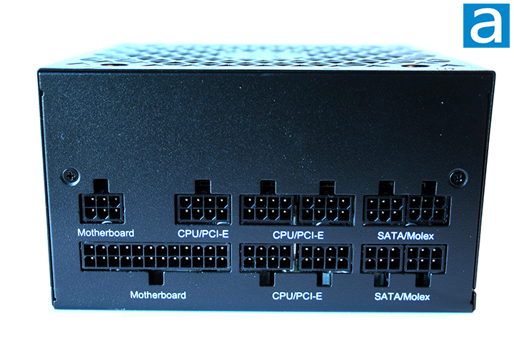 The back of the power supply contains the connection panel. The sockets are easy to identify thanks to the labels indicating which cord goes where. Starting at the top and going from left to right, we have a partial connector for the 24-pin ATX connector, three 8-pin CPU/PCIe, and two SATA/Molex sockets. At the bottom, we can see the rest of the pins for the 24-pin ATX cable. Moving to the right, we have two more 8-pin CPU/PCIe and 6-pin SATA/Molex cable headers. As with most power supplies, the design of these connectors is great with different pin configurations. This makes it so you do not have to risk plugging in a cable to the wrong port.