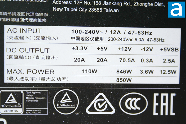 The voltage specification label for the SilverStone Decathlon DA850 Gold 850W is located on the top of the power supply unit. Two virtual rails are visible here. Up to 20A can be delivered on both the +3.3V and +5V rails, making for a power rating of 66W and 100W, respectively. The combined output for the +3.3V and +5V rail is 110W. This means the total power allocation combination must fall within the limits of the listed specifications. The +12V rail is rated to deliver up to 70.5A, making for a power output of 846W. This is done to maximize power delivery flexibility compared to multiple +12V rails. The combined power output for the SilverStone Decathlon DA850 Gold 850W is 850W, as the name implies. As a reminder, the power distribution on your system must not exceed the rated limits -- that being 66W on the +3.3V rail, 100W on the +5V rail, 846W on the +12V rail, and 850W combined between all the positive rails. The power distribution of the SilverStone Decathlon DA850 Gold 850W is reasonable for an 850W power supply unit, although I have seen higher +3.3V and 5V rails for lower output rated units.