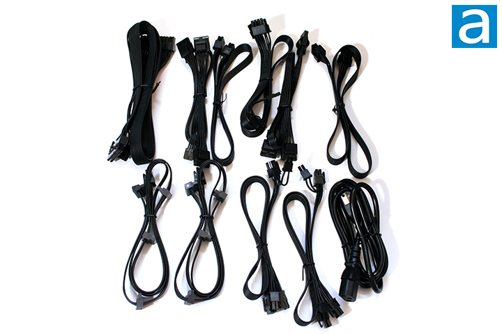 Out of the box, we get ten modular power cables and one AC power cable with the SilverStone Decathlon DA850 Gold 850W. As expected, the modular cables are quite easy to bend. The flat cables are flexible enough to allow easy cable management in a desktop computer. 18 AWG wires are found on all the cables, which is common in modern supplies. The company opted out of fattening the high current motherboard and PCIe cables to 16 AWG.
