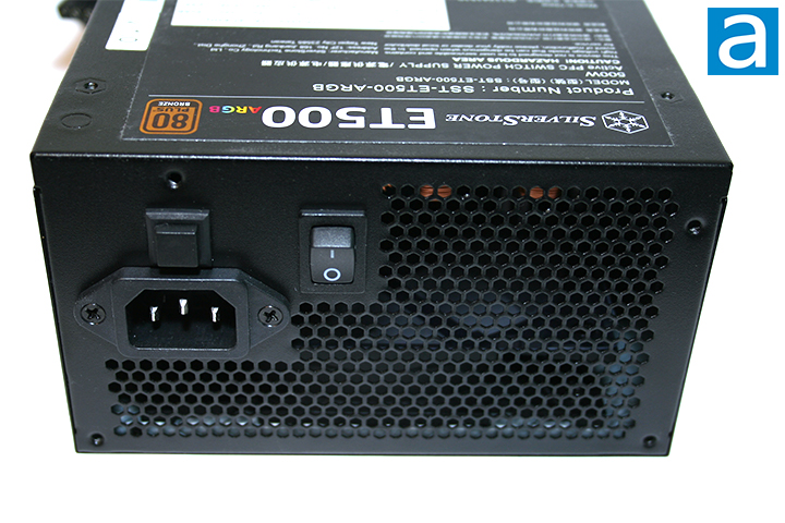 Looking at the exposed side of the power supply, we can see the power input and switch. Both the receptacle input and switch are standard, so a power cord can be reused from another device if necessary. It is important to keep in mind the thickness of the power cord you decide to use, although the recommended thickness for the SilverStone ET500-ARGB 500W is not specified, since this is not a very high wattage unit. The low resistance honeycomb mesh design is implemented to maximize airflow and minimize air resistance. Cool air is fed into the power supply from the grille at the bottom. Hot air can be discharged through the back grille after cooling down the internal components.