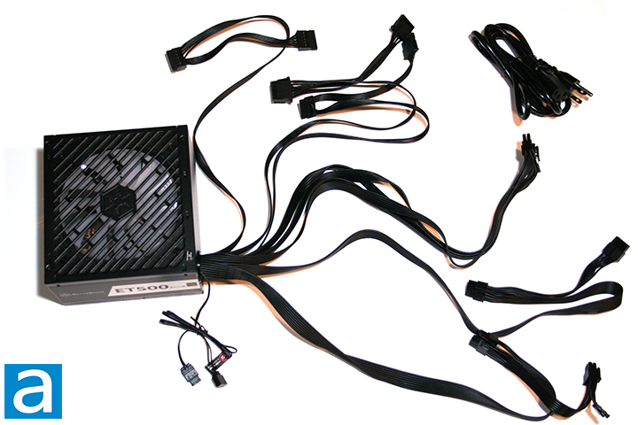 Out of the box, we get seven output power cables attached to the SilverStone ET500-ARGB 500W. These flat cables are easy to bend, making them flexible enough to route around the internal areas of your PC. 18 AWG wires are found on the high current motherboard and PCIe cables, while the remaining cables are sized at 20 AWG.