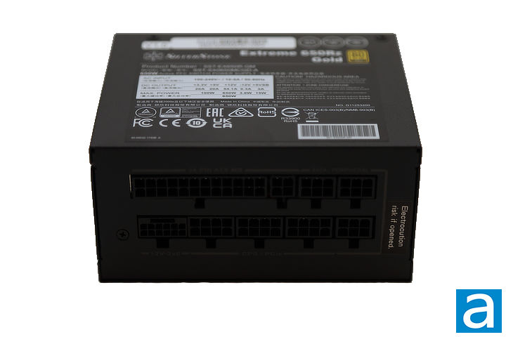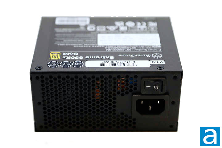 The SilverStone Extreme 650Rz Gold 650W is only available in black. On either side of the power supply, the side label displays the SilverStone company logo, product name, and its Gold efficiency rating. Interestingly, the stickers are oriented in opposite directions relative to one another. This design signals to users that the power supply can be installed with the fan facing either upward or downward while still ensuring that the branding and certification information remain readable. The exterior housing is constructed from folded metal panels with a matte black finish, which helps reduce visible fingerprints and glare. The edges of the enclosure are cleanly formed with no exposed sharp corners, contributing to safer handling during installation.