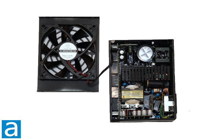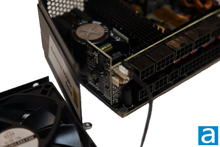 Additionally, the power supply includes a secondary printed circuit board mounted on the opposite side of the fan. Due to the small size of surface-mounted components and limited visible markings, I am not sure of its exact functionalities. This layout does help optimize space usage and thermal performance in a compact enclosure, however.