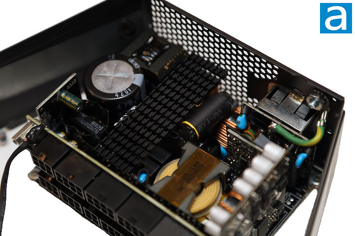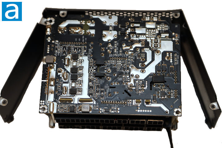 On the secondary stage, several capacitors mounted on the printed circuit board are rated at 470µF x 16V, and are used to filter and smooth the +12V output. The +12V rail is regulated by a CU6901V SLS resonant controller from Champion Microelectronics. Infineon BSC014N04LSI MOSFETs are used for high-current synchronous rectification. These MOSFETs support a 40V drain-source voltage, up to 195A continuous drain current at 25c, and have very low RDS(on) resistance of 1.2 to 1.45mΩ, helping to reduce conduction losses. Thermal pads on the rear of the printed circuit board assist with heat dissipation from these components.